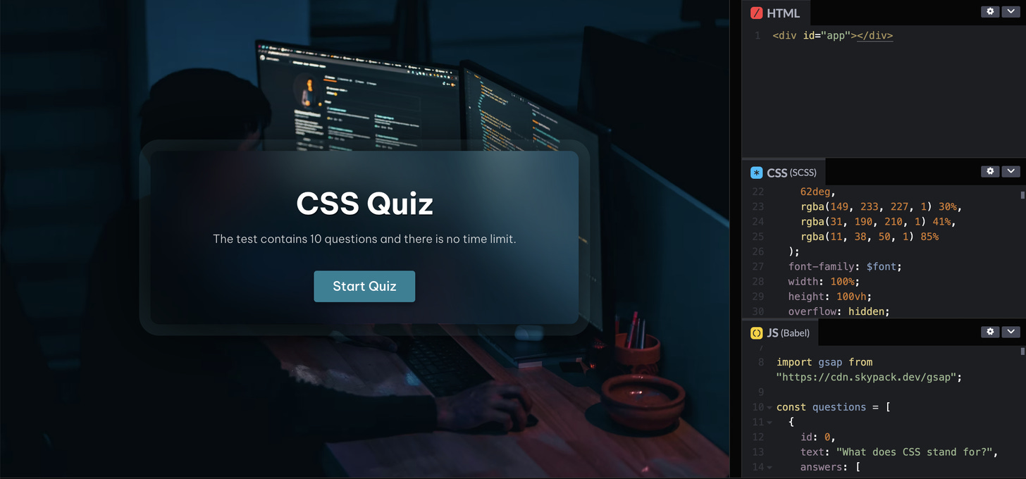 Built with React and GSAP (GSAP is a javascript animation library)Am animated 10-question quiz to really test your frontend knowledge! Made by @knyttneve