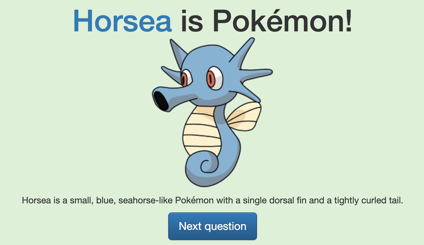 Built with React, Bootstrap, Live-ServerDo you know the difference between Horsea and Seahorse? What about Flink and Spoink?