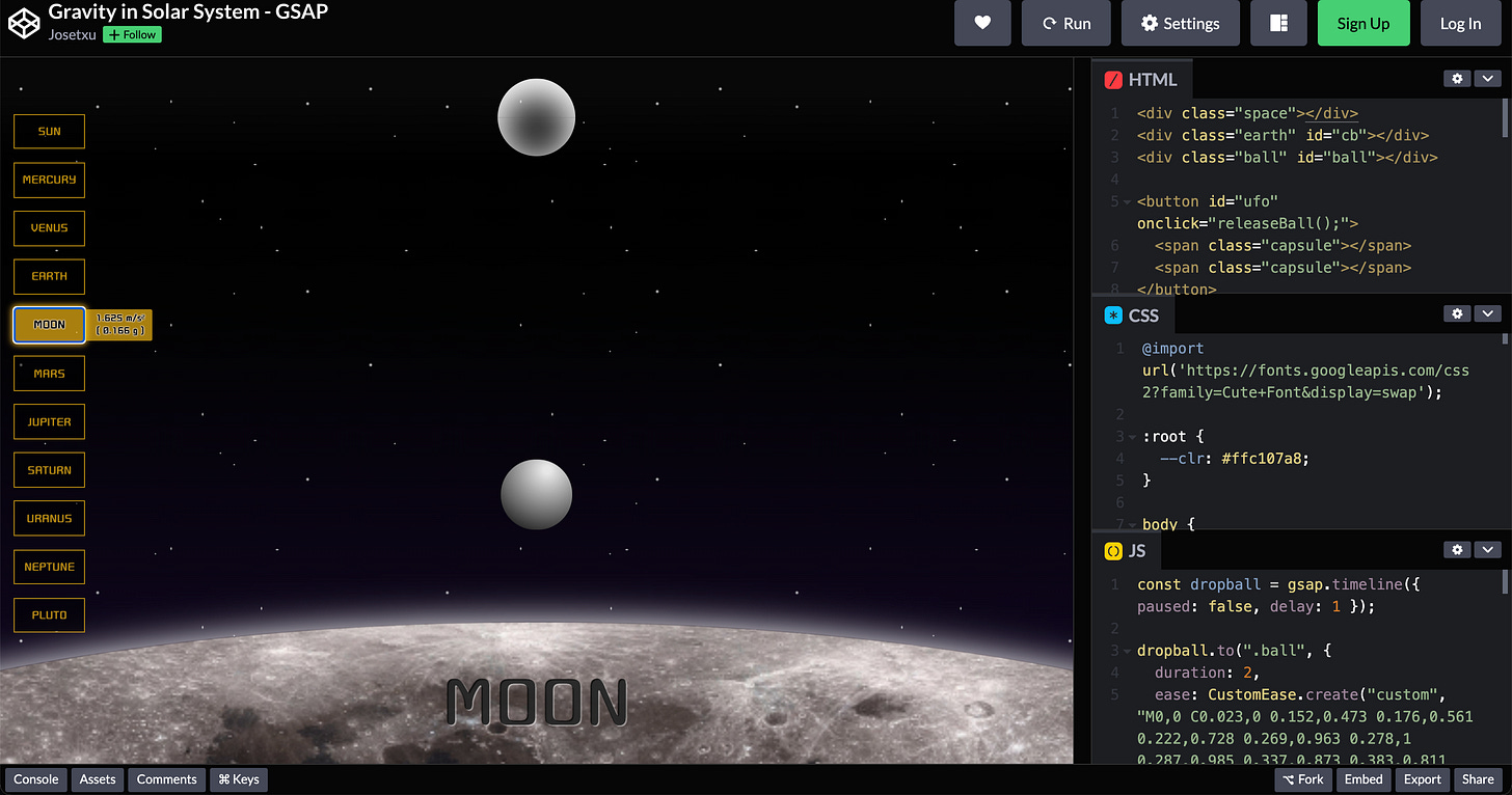 HTML, CSS, JavaScriptI love this visualization of gravity on different parts of our solar system. What I like about this project is how it takes a simple demonstration and uses front-end development to make it beautiful and easy to interact with.
