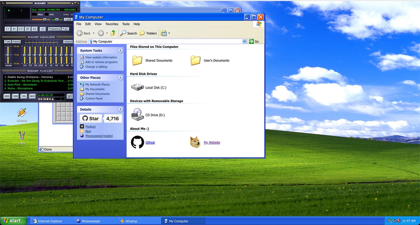 HTML, CSS, ReactLast week I showed you a macOS themed portfolio, and this week we have a Windows XP themed website by sh1zuku. It’s worth repeating that I believe a sign of a good developer is their ability to make 1:1 replicas of other sites without looking at the source code. I also love the attention to detail in this, even the time in the bottom right corner is accurate.