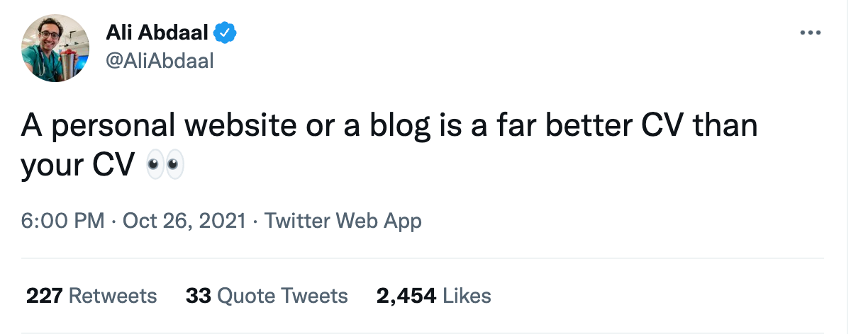A personal website is the new resumé/CV and I don’t think anyone does it better than @rafahari. It’s impossible to stand out when your CV is in a pile of other sheets of white paper and black text. A personal website is the best way to stand out as a developer.