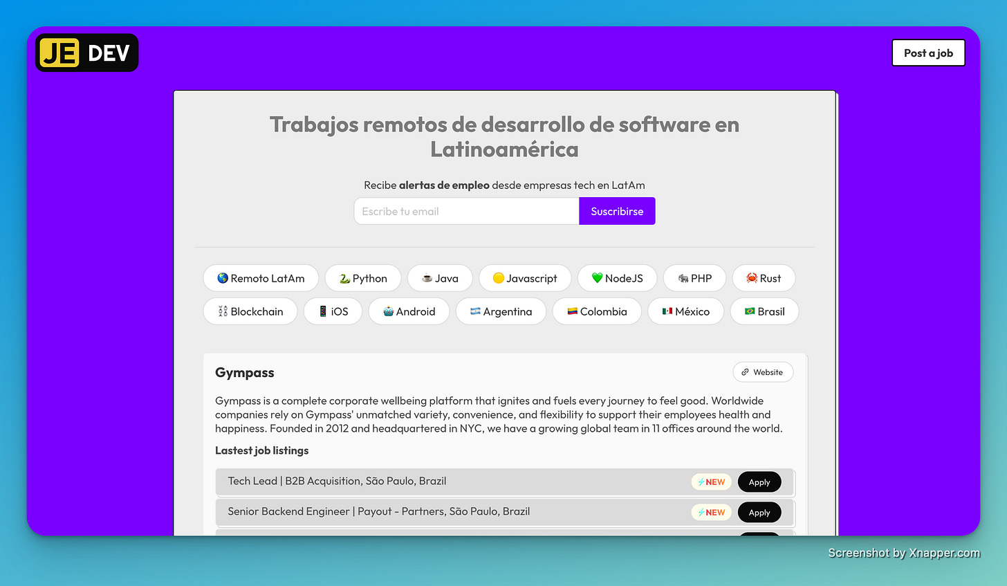 Here’s a great personal project idea! Build your own job board. This project sources web development jobs in Latin America.