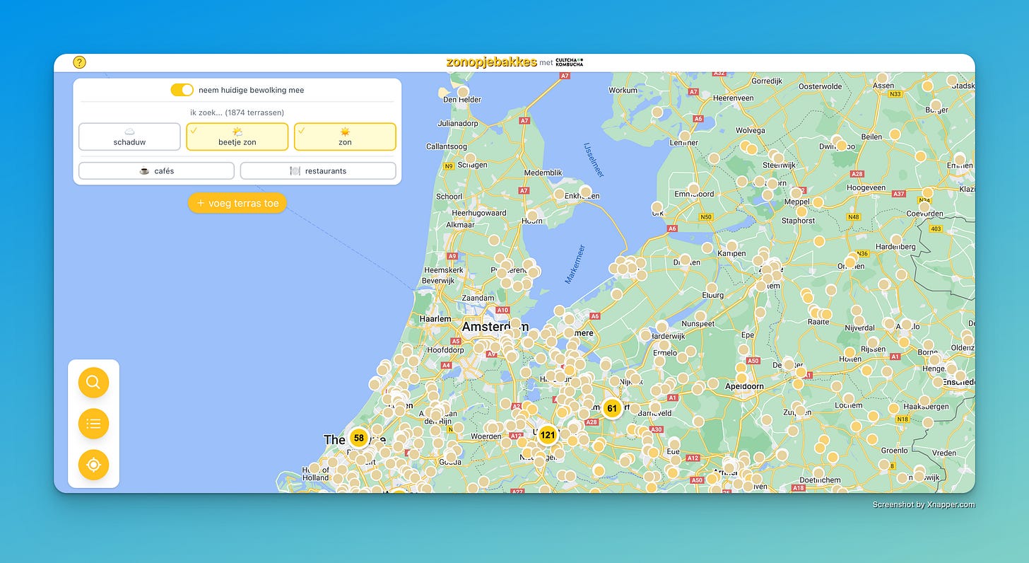 This project shows you which patios are either in the sun or partly in the sun. I don’t think I would use this in practice, but the project itself is quite impressive. Well done!