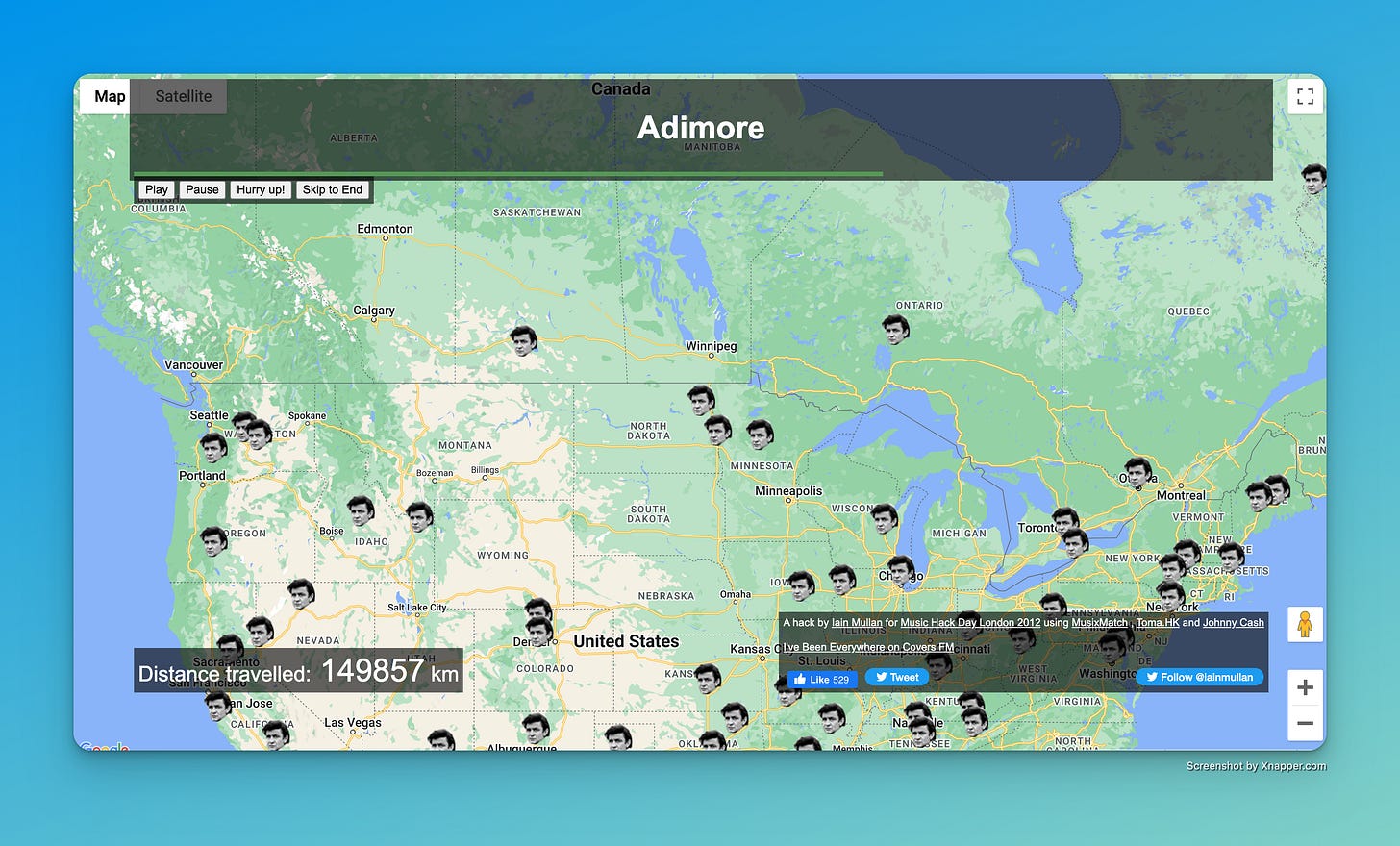 This project maps Johnny Cash's travels and calculates the distances he covered, in in time with his song "I've Been Everywhere."