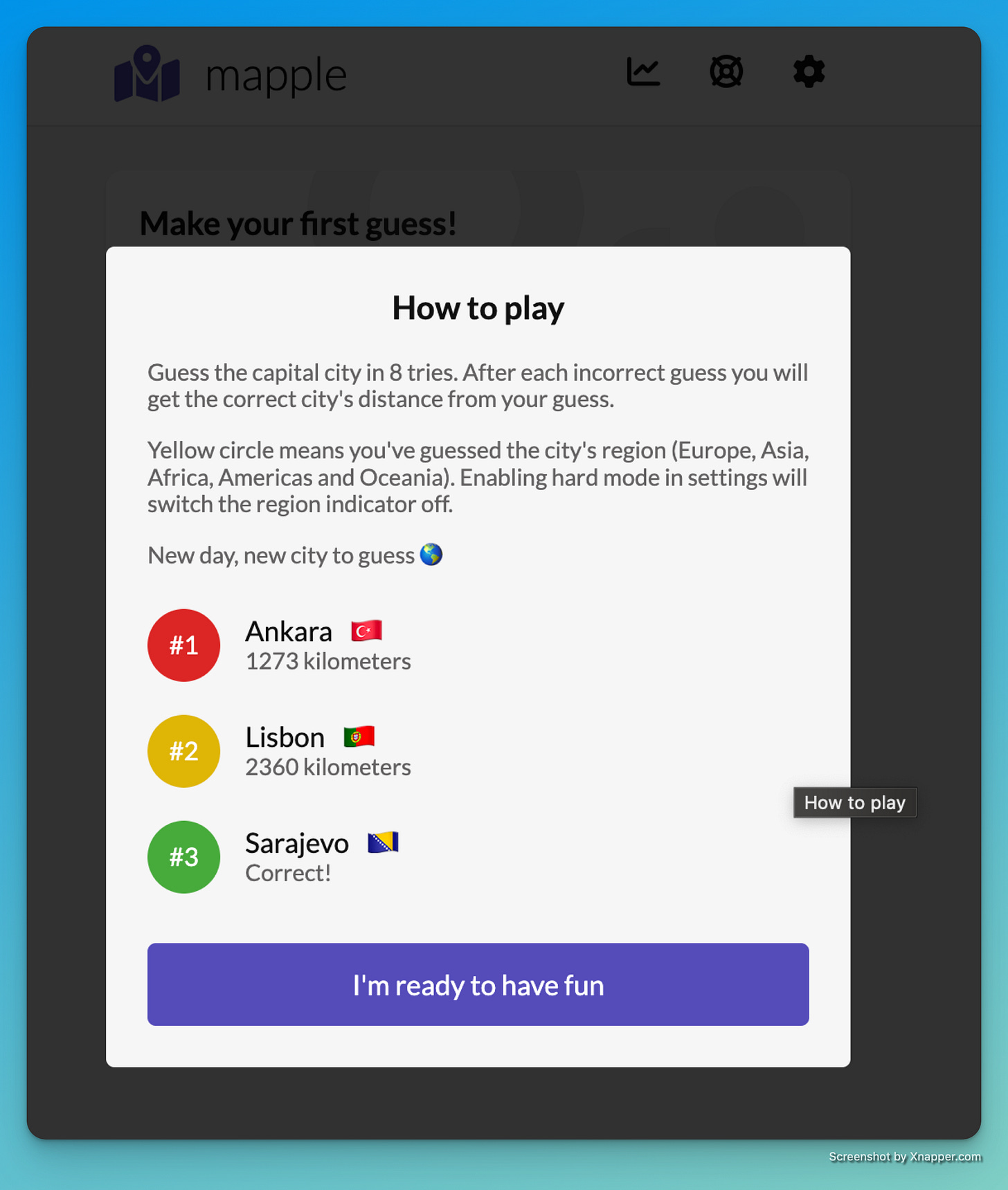 Fun daily game: start by guessing a capital city and it’ll tell you the distance to the capital city you are trying to guess. I won’t spoil today’s capital — I got it in 5 guesses.